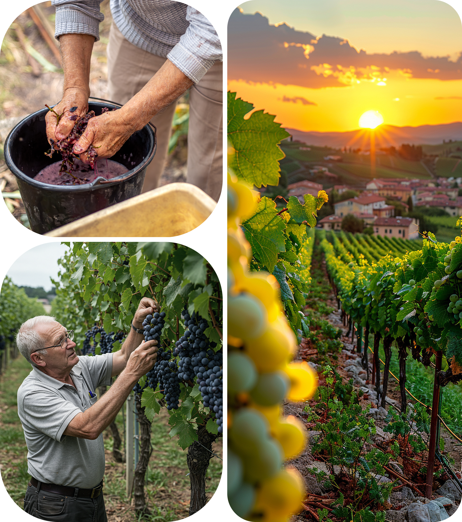 Cada uva é colhida manualmente, respeitando o ponto ideal de maturação, garantindo vinhos de personalidade marcante e textura impecável.